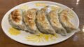 翡翠色の美しいお皿にどっしりとした餃子が6つ。